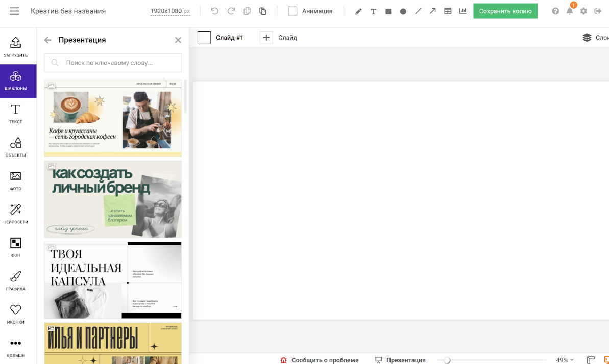 Шаг 2. Выберите шаблон или начните с пустого холста. В библиотеке тысячи готовых макетов. Введите в поиске тему, например «распродажа» или «кофе», и выберите то, что нравится.