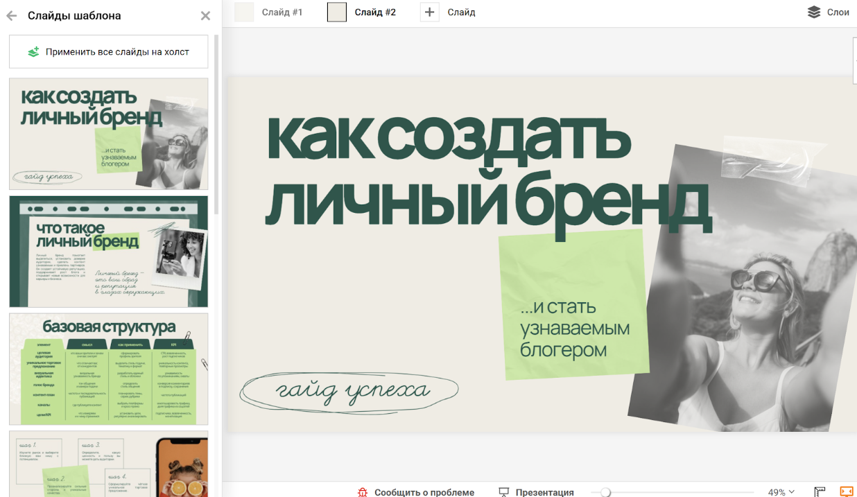 Шаг 3. Обратите внимание: в шаблонах уже есть готовые серии: титульный лист, графики, списки, контакты. Они оформлены в едином стиле. Вам остается только заменить текст и цифры.