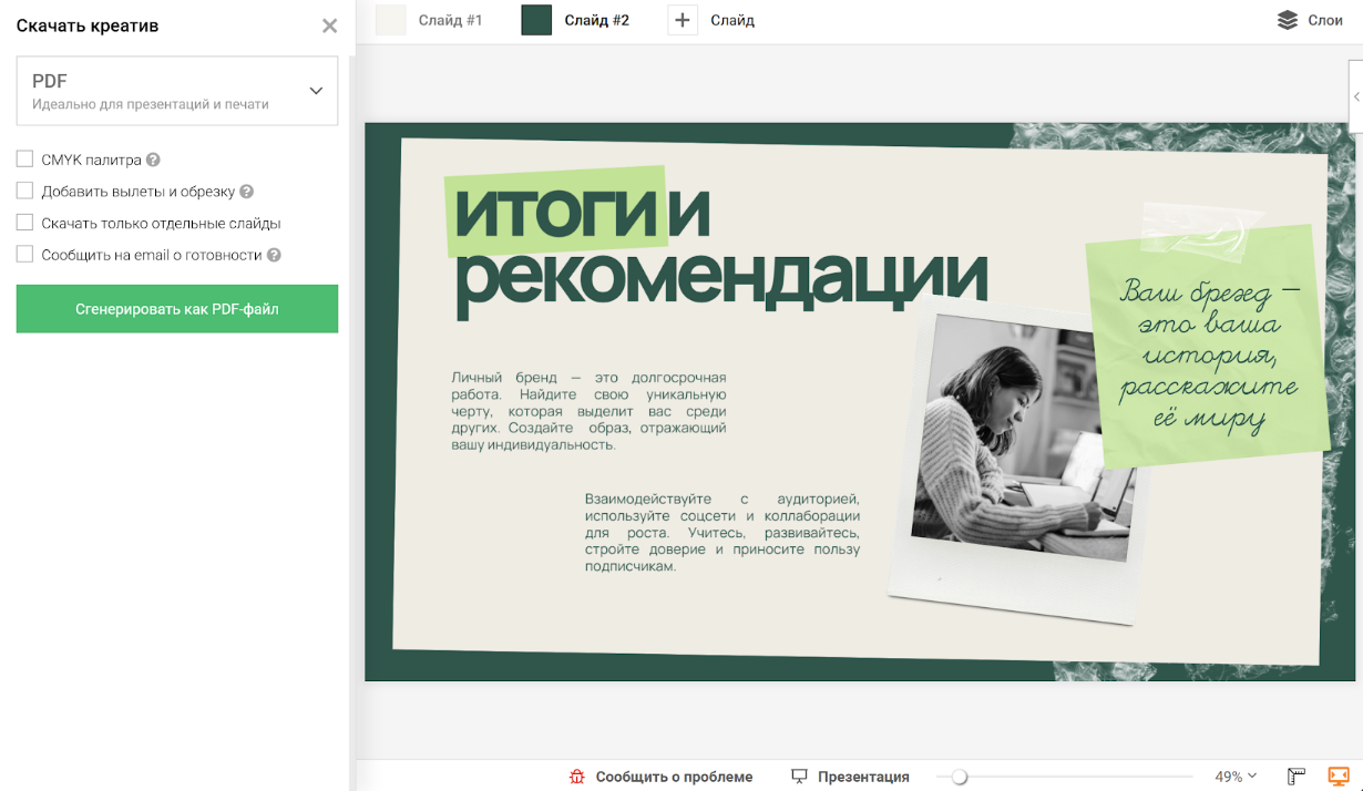 Шаг 4. Когда всё готово, нажимайте «Скачать» и выбирайте формат PDF. Именно он подходит для выступлений, отправки клиентам или печати.