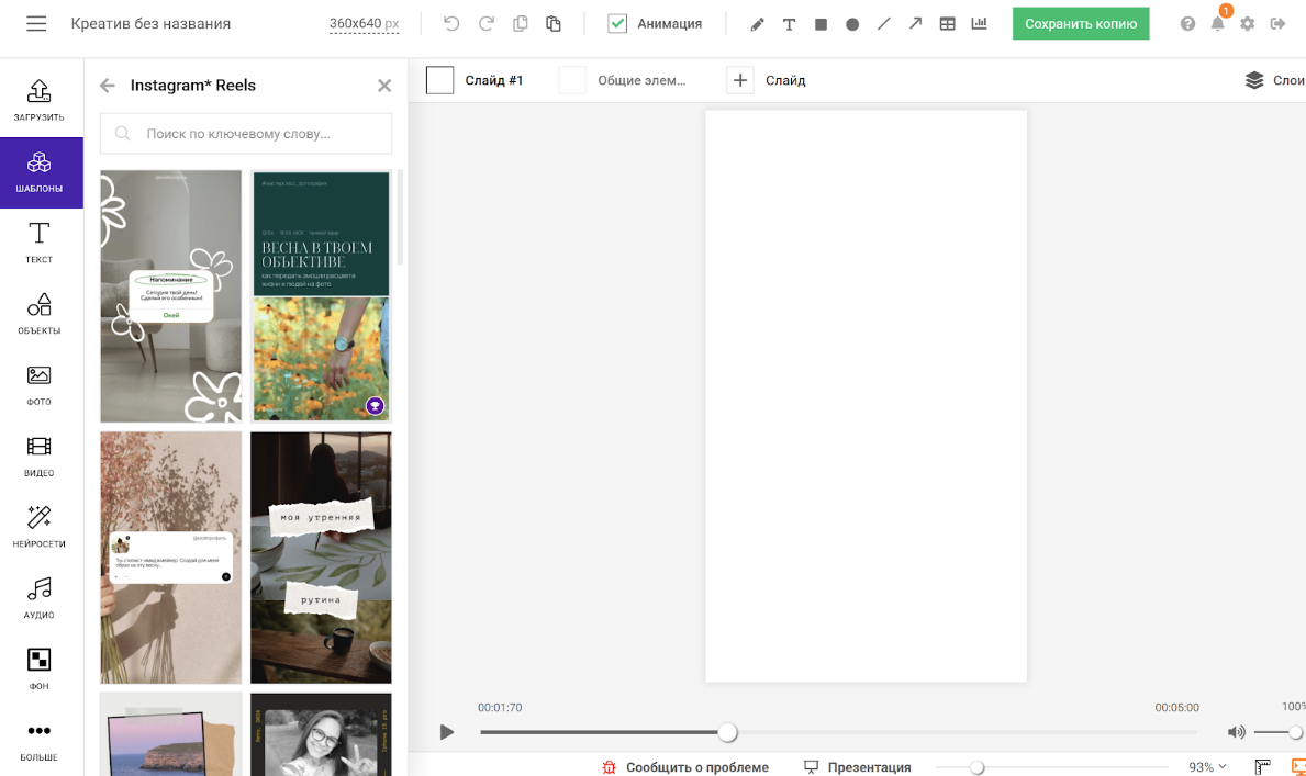 Платный тариф снимает ограничения, открывает все шаблоны, форматы и функции экспорта, убирает водяные знаки, открывает доступ к высокому качеству загрузки. Таким образом, все креативы можно свободно использовать в коммерческих целях.