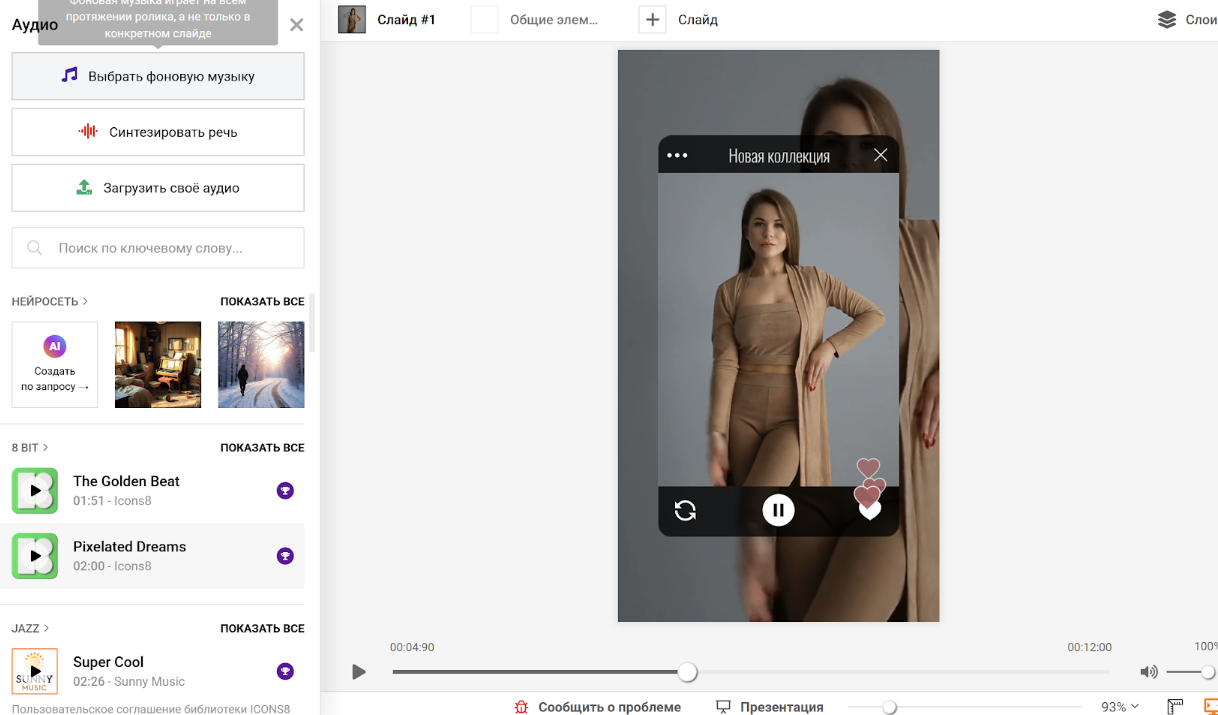 Шаг 4. Добавьте музыку или звук, если это необходимо. В разделе «Аудио» можно загрузить свой трек или выбрать мелодию из библиотеки. Там же можно добавить озвучку голосом.